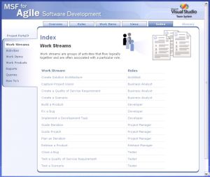 微軟在VS2005工具中用於描繪軟體開發生命週期的方法論(Methodology)稱為:Microsoft Solutions Framework(MSF),涵蓋軟體開發與基礎環境部署等完整流程的中介模型(Meta-Model)。VS2005內建兩種主流的流程範本,分別是MSF for Agile Software Development與MSF for CMMI Process Improvement。顧名思義,前者適用於小型團隊所使用的敏捷式開發流程,講求測試與原型(Prototype)、較短的開發循環與持續整合等;後者則適用於大型開發團隊,注重嚴謹的開發流程,並符合CMMI(Capability Maturity Model Integration)Level 3的要求。