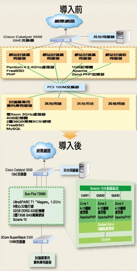 此外,當你引進Sun Fire T2000這樣「暴力」的伺服器後,交換器與網路線材都需要換上更好的產品,並且重建對整個網站架構的認知,尤其是經常被網站伺服器管理者所忽略的網路效能。