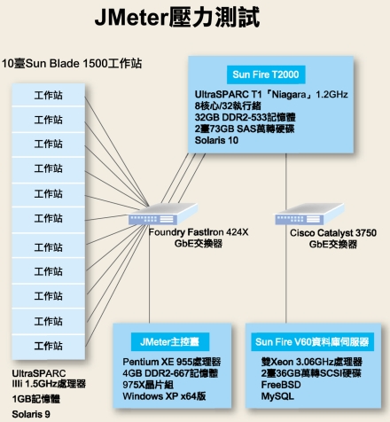 為了達成最高的效能,我們刻意隔離資料庫伺服器與工作站群的網路。此外,我們也透過IPMP軟體,分散Sun Fire T2000上GbE埠的流量。 模擬的動作假設使用者先進入巴哈首頁,點選討論區登入首頁,選擇討論區,再閱讀討論區文章,在30秒內做完七個連續動作。所有的Sun Blade 1500工作站都送出100至300這樣的存取需求,我們再經由JMeter主控臺所計算出的反應時間與輸出量,同時直接監測Sun Fire T2000的系統效能,確保系統真的有被「操」到。 我們在Sun教育訓練中心架設JMeter壓力測試環境,透過模擬巴哈姆特使用者行為,「壓榨」Niagara的效能,使用設備包含Sun Fire T2000、Sun Fire V60、Cisco Catalyst 3750交換器、Foundry FastIron 424X交換器、用來執行「轟炸任務」的10臺Sun Blade 1500工作站,以及做為JMeter主控臺的Pentium XE 955個人電腦。 |