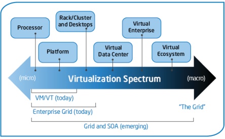 英特爾資深院士兼軟體解決方案事業群總經理Richard Wirt在八月Intel Software Insight雜誌的「The Convergence of Virtualization, Grid, and SOA」文中表示,相較於微觀的處理器虛擬化,網格運算(Grid)與近來紅透半邊天的SOA,就是巨觀的虛擬化,象徵著融合成一個整體的企業IT與運算架構。