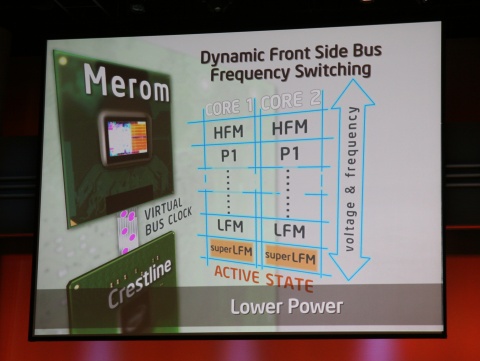 從Napa開始,Centrino支援系統匯流排低時脈模式(Low Frequency Mode,LFM),處理器與系統匯流排可按相同比例同步調降時脈,減少系統的耗電量。但Napa的LFM有其限制:Centrino的處理器最低時脈是系統匯流排基頻的六倍,換言之,假設667MHz系統匯流排的基頻是167MHz,處理器最低時脈就僅能降至1GHz,無法更低,未來提昇至800MHz/1067MHz情況將更加嚴重。為此,Santa Rosa新增動態系統匯流排調控,處理器端視情況產生「虛擬時脈」,實際上僅以一半的時脈運作,800MHz系統匯流排即可讓處理器時脈壓低至600MHz。