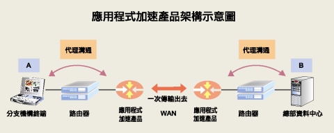 設置在總部和分支機構的應用程式加速產品,會擔負起與終端和伺服器端溝通的責任,以大幅減少因為網路傳輸封包時,過多的重覆確認。