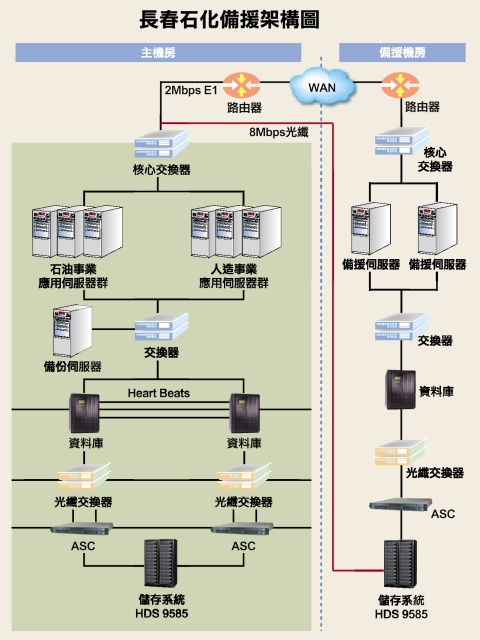 目前長春石化的主機房與備援機房之間是以8Mbps的光纖連結,並用E1專線作為備援網路,透過飛康的IPStor將ERP系統/資料作遠端複製,而異地機房內有備援的伺服器、資料庫和儲存系統。