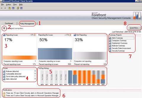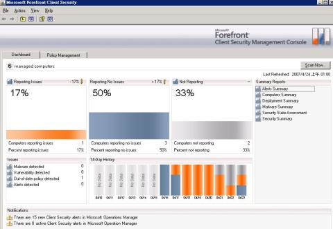 Microsoft Forefront Client Security Console是FCS的主控臺,首頁畫面以高度圖形化的儀表板(Dashboard)方式呈現,整體設計相當直覺易懂;畫面上方所顯示的是目前接受FCS伺服器控管的用戶端電腦數量,以及即時掃描的功能鍵,執行之後,FCS會跳出對話方塊詢問管理者是否針對所有,或者是單一電腦做掃描,除此之外,也可以設定是否啟用完整模式進行掃描。