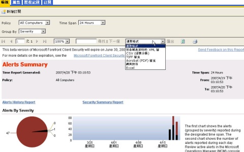 儀表板的左側與下方所顯示的是偵測到的威脅數量,與安全警示;中央的區塊所顯示的是目前分析所得的資安趨勢圖,這裡可分做兩大部份,一種是即時性的統計值,另一種是過去14天的資安趨勢,可協助管理者快速了解目前接受FCS伺服器管理的電腦是否安全無虞;有一點值得注意的是,由於儀表板的圖表和報表一樣,都是透過Reporting Services所產生,因此我們需要將FCS伺服器加入到IE的信任伺服器清單,如此才能讓圖表正常顯示,否則所顯示的將會是無法連接資料庫的錯誤訊息。