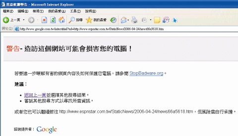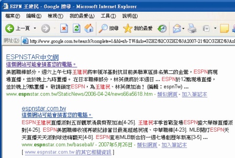 | ESPN衛視體育台在Google中的連結,被加註危險警告,雖排序第一,但使用者可比較其他網址的安全性,會影響瀏覽意願。 |