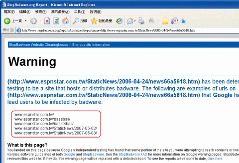 | Google分析ESPN衛視體育台中至少有5個惡意網址,截至截稿前,ESPN衛視體育台網址下1050個相關連結均被標示為惡意網站,包括2003年的新聞連結。使用者欲瀏覽這1050個網址,必須自行於網址列手動鍵入網址,嚴重影響透過Google查詢的使用者上站意願。ESPN衛視體育台修補漏洞後,需自行向StopBadware機構申請網址複查,Google收到StopBadware複查結果通過後,才會將警告移除。