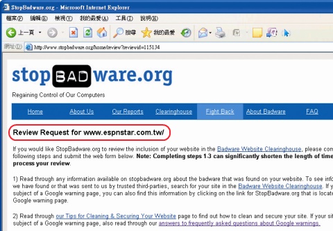 ![]() 企業主可要求StopBadware複檢Google分析的結果。Google不提供網站主直接回應的要求,而是提供網站主向第三方獨立機構StopBadware申請複檢的機制。 |