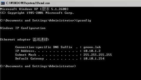 PC1完成開機之後,在終端機模式下輸入ipconfig指令,查詢電腦目前的網路組態,可以看到子網路遮罩的設定是255.255.255.255,此時只能連接Sophos NAC Advanced的主控臺,但無法存取PC2。