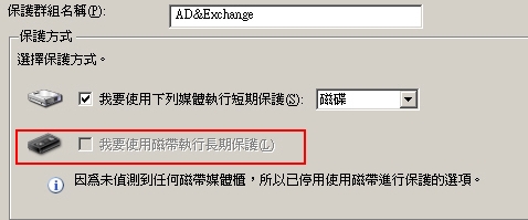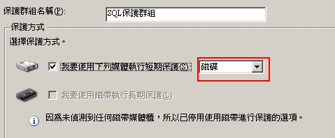 | 備份步驟2 :選擇保護方式 DPM對資料庫的備份方式,能以磁碟或其他儲存媒體。由於我們的DPM測試環境並無磁帶機,若有安裝,就能選擇磁帶長期保護。