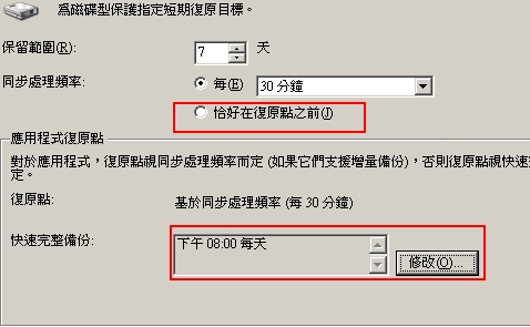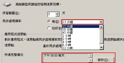 | 備份步驟 3:設定資料保護周期 此處設定資料備份週期,其保護時間可設定1至448天,同步頻率最短則可設為15分鐘,最長為24小時。