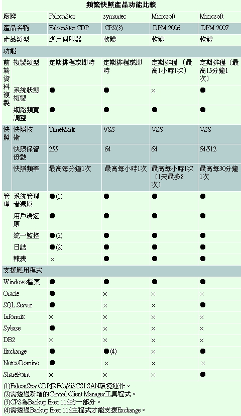 除了微軟的DPM外,市場上主要的頻繁快照型備份產品還有FalconStor的CDP,以及Symantec放在Backup Exec 11d中的Continuous Protection Server(CPS),這三種產品無論在系統架構、運作模式,還是操作方面都十分近似,但在支援能力以及環境需求上有所差異。