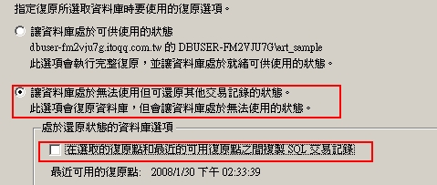 若是我們在步驟2,選擇還原覆寫至原來的資料庫,就會跳過步驟3。這裡要決定資料復原時,要讓它繼續運作,或是要離線,直到復原結束。 |