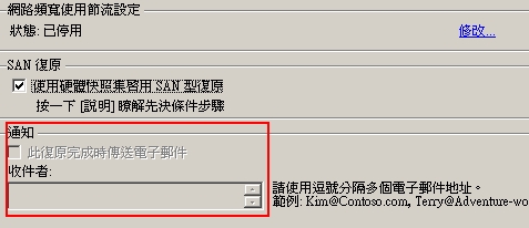 DPM復原資料庫時,可以設定網路節流,避免復原過程消耗太多頻寬;SAN復原則支援以其他網路儲存設備還原。 |