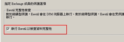 | 備份步驟3:執行完整性檢查 DPM會自動執行Eseutil程式,檢查資料完整性。以磁碟保護時會在DPM伺服器上執行,用磁帶備份會在Exchange伺服器上執行。 |