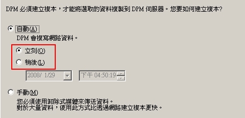 | 備份步驟 5:選擇複本建立時間 DPM會為受保護的資料庫建立一複本,建立時會使資料庫主機及網路的負荷量增加,為避免影響系統運作,可選擇時間排程處理。