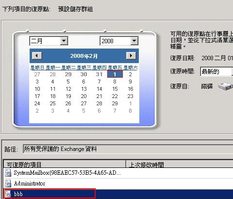 | 還原步驟 1:選擇還原點 在還原選項操作頁面左方選擇Exchange伺服器,系統會用日曆以粗體顯示可還原日期,能回復信箱與公用資料儲存區兩個部份。 |