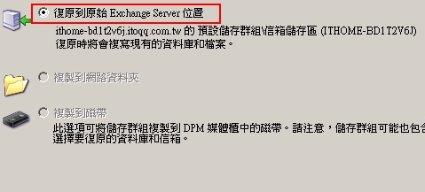 | 還原步驟4 :指定復原目的地 你可以指定目的地,直接回存正在線上運作的Exchange儲存區。若要還原到更早之前,就得先將儲存區設定成可還原複寫。 |