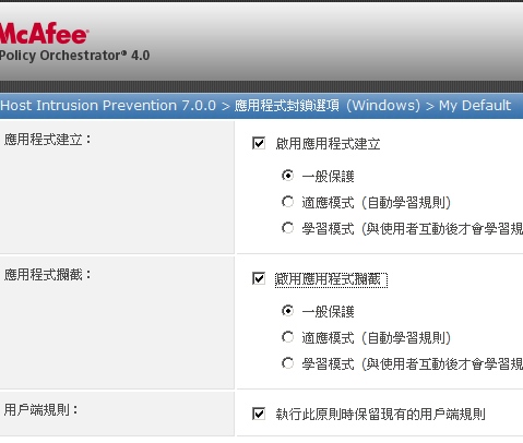 ![]() 操作模式 針對應用程式控管,McAfee的主機型IPS提供「一般保護」、「適應模式」,以及「學習模式」三種方式,透過預設安全值、自動學習、條件輸入等方式,訂立不同需求的管理策略。 |
