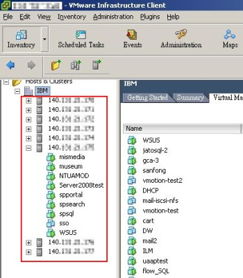 | 臺灣藝術大學在8臺實體伺服器中平均虛擬出約6~7臺虛擬機器,每臺伺服器負載量不超過60%,強化運作的穩定性。(如紅框所示) |