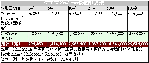 相較之下,XenServer的授權計價方式是最簡單的,因為付費版本XenSource白金版就包含了Hypervisor與管理工具,管理功能包括線上移轉虛擬伺服器的XenMotion、管理工具XenCenter、資源池(Resource Pools)與伺服器Provisioning等。所以,依照先前的計價模式,Windows Server 2008 Datacenter版本的授權費是86,860元,再加上XenServer白金版授權費210,000元,所以,採用XenSource虛擬化方案,1臺實體伺服器的軟體費用是296,860元,比起VI 3.5的整體授權費便宜約44萬元,相較微軟的Hyper-V則是貴了約10萬元。