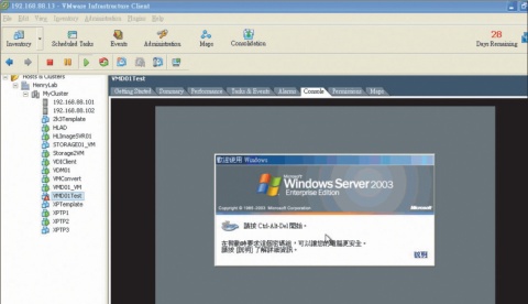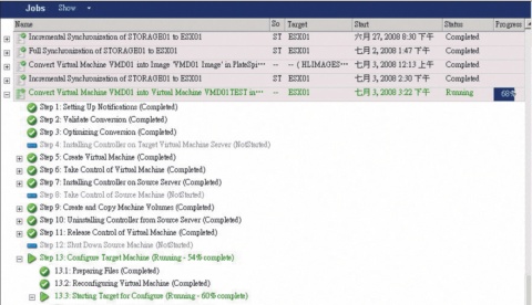 零壹科技技術經理張振佳以PlateSpin PowerConvert為例,示範如何利用P2V工具完成實體虛擬轉換。PowerConvert是一套專業的轉換工具,可提供P2V、V2P、P2I等不同類型的轉換,來源端能支援Windows、Redhat/SUSE Linux等不同環境的主機,目標端則能支援VMware、微軟Virtual Server與Citrix XenServer等虛擬平臺。![]() 第1步 挑選欲執行轉換的實體主機 從PowerConvert主介面挑選欲執行P2V轉換的電腦,只要存取權限足夠,你就能點選群組中的主機,轉換為虛擬機器。 ![]() 第2步 執行轉換前設定 依PowerConvert的精靈介面引導,逐一設定轉換前各項須完成的動作,如設定目標電腦、VM組態等等。 ![]() 第3步 P2V轉換作業監控 PowerConvert提供了極精細的轉換期間狀態檢視功能,可清楚的看到目前P2V執行進度,以及執行狀況。 ![]() 第4步 轉換完成 可選擇轉換後將虛擬機器自動開機或手動開機。整個P2V作業所需時間,視可用的網路頻寬而定。 |