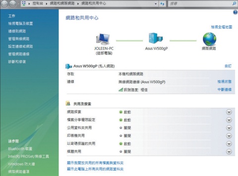 | JOLEEN-PC這臺電腦,透過Asus W500gP存取點(AP),連上Internet,這是Vista的新功能,網路地圖顯示功能。 |