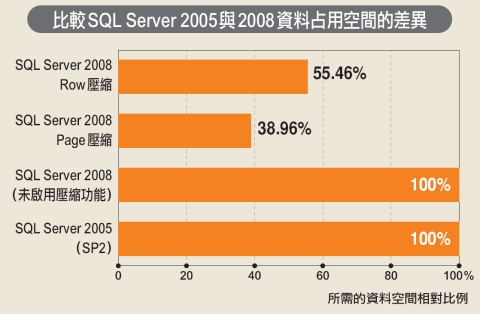 當我們建立資料壓縮時,可以選擇以「頁面(Page)」為單位壓縮,或以「資料列(Row)」為基準,當然,壓縮比會根據資料內容而有不同結果,通常以文字、數字為主的資料,得到的效果會比二進位資料較佳。在SQL Server 2008中,僅有企業版支援此功能。