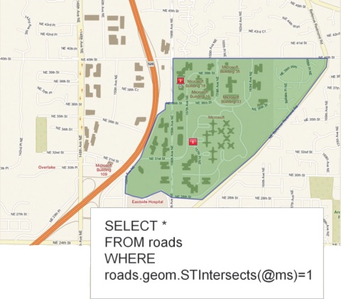 | 支援空間資料類型與相關函式 SQL Server 2008不但可儲存地理空間的經緯度,並提供空間函式(.NET內建),以本圖為例,開發者可透過SQL指令查詢與微軟園區交錯的道路,若是再與Google Map或Virtual Earth結合,即可提供地圖服務。