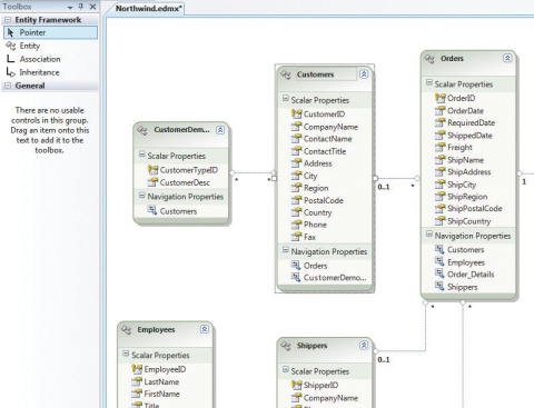 Visual Studio 2008升級至SP1之後,將提供視覺化的精靈及操作工具,處理資料實體與資料庫的對應。主要的功能包括透過實體資料模型(Entity Data Model)匯入現有資料庫的資料表,再以此為基礎,設定資料表之間的關聯,然後經由概念模型(Conceptual Model)處理資料表與資料實體兩者的對應。