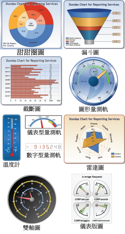 | 微軟買下合作夥伴Dundas 的技術,推出圖表(Chart)及量測軌(Gauge)兩類圖表元件,包含多種樣式,開發者可突破圖形的限制,例如只有一兩個數字特別突出的圖表,可以使用截斷圖;溫度資訊可選擇溫度計;雙軸圖則將單一元件分為內外兩圈,呈現兩種數據。透過多樣化的元件,企業可達到過去難以呈現的效果。(資料來源:Dundas,iThome整理,2008 年8 月)