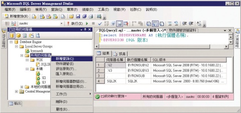 到了SQL Server 2008,鏡像資料庫加強了資料即時復原的功能,在具有鏡像資料庫及見證伺服器的架構下,當SQL Server2008發現資料表出現異常時,就會透過見證伺服器,將交易記錄轉移到鏡像資料庫上,即時自動修復資料表。在我們的實際觀察,資料表重建的時間非常短暫,當初次資料查詢語法回傳資料庫損毀的結果後,於第二次執行查詢指令時,伺服器就 透過組態伺服器建立伺服器群組,除了能針對特定資料庫集中管能夠將原本的資料即時回傳。文☉林郁翔 |