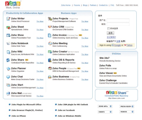 | Zoho提供的服務項目超多,連CRM和人力資源之類的服務都有提供。我個人覺得它的Writer功能完備還頗吸引人,可惜簡體中文的介面倒不是很令人滿意。 |