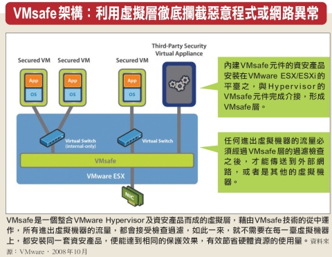 VMsafe的運作架構相當簡單,相當於我們在每一臺虛擬機器前面放置一臺安全檢查設備,去過濾進出這些虛擬機器的所有流量,於是虛擬機器就不需要安裝任何的軟體便能得到保護,因此可以省下不少的硬體資源,而實際上,資安產品僅是安裝在VMware ESX/ESXi平臺之上的一臺虛擬機器而己。
