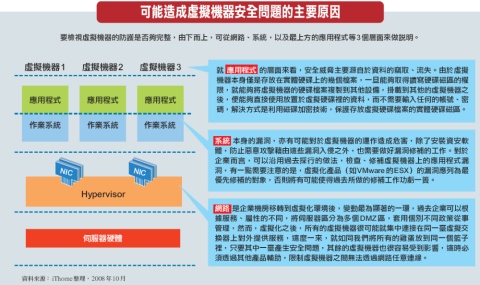 虛擬化之後,所有的虛擬機器很可能就集中連接到同一臺虛擬交換器(如VMware ESX/ESXi,微軟的Hyper-V),或者經由「虛擬──實體」網卡之間的橋接(如VMware Server/Workstation,微軟的Virtual Server/PC),與外部網路進行通訊。在這種架構之下,原本可以透過防火牆採取阻隔的防護就會消失不見,Check Point臺灣區技術顧問陳建宏就表示,屆時只要一臺虛擬機器發生問題,安全威脅就可以透過網路散布到其他的虛擬機器。