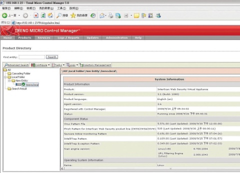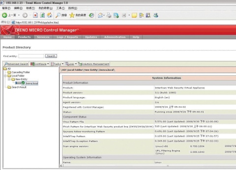 當透過IWSVA的網頁介面,實際將這套產品註冊到TMCM時,在TMCM的網頁介面上,我們找到一臺新增加的IWSA設備(但並未注明是Interscan Web Security Virtual Appliance或辨識出它是虛擬化的版本)。登錄到TMCM後,我們可以在這套集中管理介面上,以瀏覽器檢視IWSVA在運作過程中所記錄下來的各項資訊,例如目前已阻擋下來的檔案與網頁總數,所攔截的惡意程式數量,以及目前系統所載入的病毒碼版本等,同時也可以從這裡再登入IWSVA的網頁介面,更直接地設定各項功能。