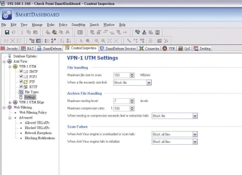 VPN-1 VE也內建的掃毒引擎,它可以針對HTTP、POP3、SMTP以及FTP等網路傳輸協定,來掃描這些形態的流量,目的是為了避免病毒等安全威脅,在連接網頁及郵件伺服器的時候,一併進入企業內部。