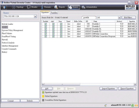 更新特徵碼的同時,這套產品也會對於久未使用、視為無效的特徵碼,自動執行清除的動作,避免IPS的特徵碼資料庫過於肥大,進而影響系統檢查網路連線的效能。VSA除了使用原廠提供的特徵碼之外,我們也可以依據需求,手動匯入Snort的特徵碼,進一步強化系統的檢測能力。