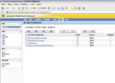 可手動調整電子郵件的管制政策7.7版產品內建了Vontu的功能模組,能針對郵件進行掃描,檢查其中是否含有不允許外流的機密資訊。 |
