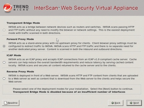 相較於多數還在觀望的資安廠商,趨勢對於虛擬機器的防護相當積極。除了這次我們所測試的IWSVA之外,像是專司郵件過濾的IMSA(InterScan Messaging Security Appliance)等產品,未來將推出能夠在VMware虛擬化平臺部署的版本,此外,這家公司也預計推出整合VMsafe技術開發而成的新款產品。不過很可惜的是,IWSVA的部署和其他3款送測產品的方式有些不同,原廠並未提供事先做好的虛擬檔案,讓建置的技術人員能夠直接匯入至虛擬化平臺,以目前來說,利用光碟手動安裝,仍是這套產品的主要的部署方式。