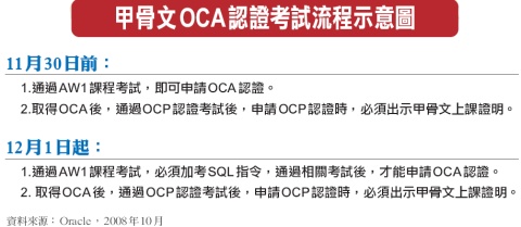 甲骨文入門的Oracle 10g OCA(Oracle Certified Associate)認證在考試科目上出現變化。甲骨文宣布,所有想要取得OCA認證的考生,若沒有在2008年11月30日前通過OCA的AW1課程的考試,未來想要取得OCA認證時,都必須加考SQL指令考試。