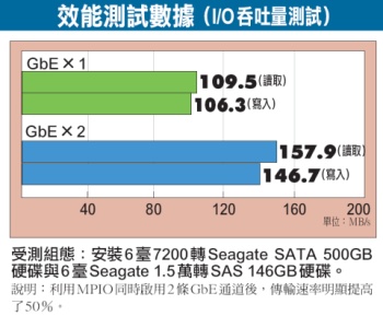 我們以HP StorageWorks MSA2012i iSCSI磁碟陣列為對象,示範建立多路徑存取的步驟。由於MSA2012i只支援MPIO,而借測的這臺MSA2012i也只有1組控制器與2個iSCSI埠,故此處只進行單一控制器的MPIO設定。 首先,我們為測試平臺微星X2-106S3R的2個網路埠分別設定192.168.123.184與192.168.123.191的IP位址。然後為MSA2012i上的2組iSCSI埠(Port 0與Port 1)分別設定192.168.123.150與192.168.123.151的IP位址。主機與儲存設備上的2個埠,最好是分別位於2個子網路中,不過我們這裡為了方便,仍設於同一個子網路。 然後登入MSA2012i的控制臺,建立1個100GB的Volume,並映射給測試平臺的iqn,同時設定這個Volume使它可同時接受Port 0與Port 1存取。 接下來在測試平臺上啟動微軟iSCSI Initiator,將測試主機的2個網路埠分別與MSA2012i的Port 0與Port 1各自建立1條通道。我們在測試中選擇Round Robin的負載平衡模式,以便同時啟用2條傳輸通道。 從測試結果可以看出:和只使用1條通道時的測試數據相比,Round Robin下啟用2條通道後,由於傳輸負載會輪替的分散到2條通道上,因此可用頻寬增加許多,得到的傳輸速率提高了50%。而且此時即使有1條通道中斷,測試平臺對MSA2012i的存取也不會中斷,仍可利用剩下的1條通道維持連接,無論效能或可靠性都提高了。 |