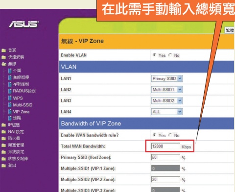 在這臺路由器提供的管理功能中,較特別的是多重SSID及獨立VIP Zone。我們可利用這項功能,對不同的使用者設定專用的SSID名稱、安全性,以及加密的金鑰字串,最多可設定4組。 至於VIP Zone的頻寬管理功能,則可分配不同的頻寬給這4組SSID,設定時需先填寫目前網路環境的對外總頻寬,再指定各SSID可分配到的百分比。 不僅如此,RT-N11也內建家用閘道器、路由器,以及無線網路橋接器(Access Point,AP)等工作模式,IT人員只要透過瀏覽器登入管理介面,就能輕鬆切換。 如果設定為家用閘道器模式,這款設備將自動啟用NAT,並允許使用者透過PPPoE或DHCP等方式連線至網際網路。無線網路橋接器模式則會取消NAT,並將標示為「WAN」的連接埠,橋接至另外4組標示為「LAN」的連接埠,並建立為區域網路。至於路由器模式則可依使用環境需求,動態調整NAT的狀態。 在耗電量方面,這款產品在WAN端及LAN端各只連接一條網路線的情況下,我們測出的耗電量約為3瓦,即使是滿載(LAN端的4個網路埠都接上電腦)時,耗電量也保持在5瓦以下,與我們先前曾經報導過的同級產品Corega CG-WLBARN12幾乎完全相同。 在設備使用上,由於RT-N11採用塑膠外殼,並在上蓋、底座與側面設計許多散熱孔,無論是平放或直立(需搭配產品隨附的直立架)擺放,散熱性都十分良好,而且本身的溫度也僅略高於室內溫度。文⊙李世平