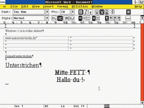 | Word 1.1 for Windows是最早在Windows上發表的Word,這是在Windows 2.0上面執行的畫面,雖然畫面不算美觀,但已經有不錯的表格功能,也有初步的「所見即所得」。事實上,這版本相當罕見,2.0版才是真正大賣的第一套Windows版Word。 |