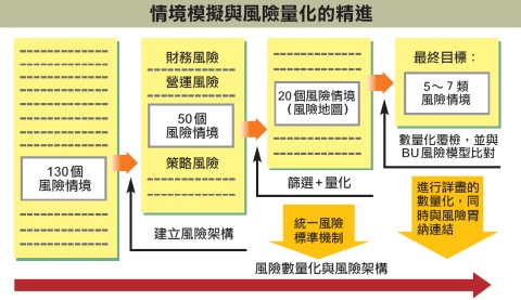 不過,這都只是玉山銀行風險胃納機制的基本原則,楊恆華表示,為了做好全面性的風險控管,玉山銀行自從2005年就開始發展風險胃納機制,並且針對整體環境以及各業務發展,未來可能面臨的風險,藉由情境分析進行壓力測試,然後把重大的風險損失進行量化。