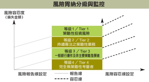 目前玉山銀行的風險胃納分級以及監控,主要分為4個重要等級,其中,被列為第一等級的是「策略性的投資」,第二等級則是「持續專注的策略性業務」,第三等級是「一般銀行運作以及非主要策略發展者」,而第四等級是「完全無策略性考量者」。