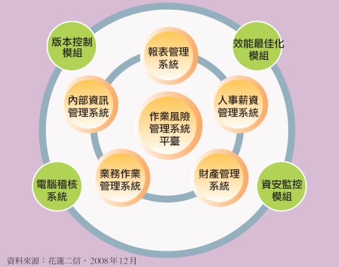 在這樣的考量下,花蓮二信的作業風險管理平臺,同時整合了人事薪資管理系統、財產管理系統、存放等業務作業系統、內部資訊管理系統以及報表管理系統等,透過作業風險管理平臺,花蓮二信雖然可以即時掌握各個系統的作業,是否符合風險控管的要求,但是,各個系統的版本控制以及系統效能最佳化等,也成為作業風險管理平臺的一項重大挑戰。