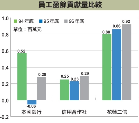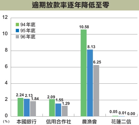 花蓮二信的作業風險管理平臺上線之後,已經有很多效益相繼顯現。其中,銀行業者最為看重的逾放比,就從民國94年底的0.05%,逐漸遞減到民國95年0.01%,民國96年底的逾放比,更已到達0.00%。當然,這樣的數據表現,一方面是因為花蓮二信完全不碰高風險的產品,例如:信用借款等,另一方面則是作業風險管理的效益,大幅改善資料調閱與平臺查詢的時間。