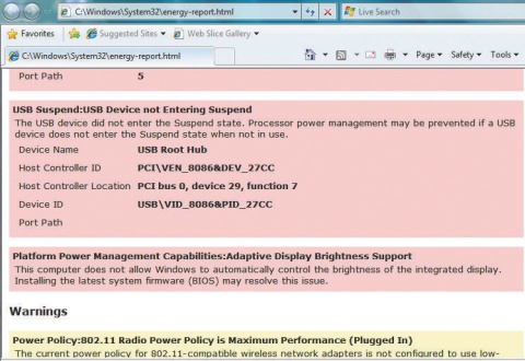 | Windows 7具有內建的電源檢查指令,只要開啟命令提示字元,輸入「Powercfg /energy」,便會自動偵測系統的電源設定,如果發現警告或錯誤訊息,也會在記錄檔中顯示相關的名稱及發生原因(如圖)。 |