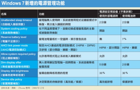 除了與省電相關的功能外,微軟的新作業系統在電源設定上也有幾項更便利使用者的相關調整。舉例來說,過去如果用全螢幕播放影音檔案,或是使用簡報功能時,一段時間後,系統經常會自動關閉顯示器,並進入睡眠狀態。到了Windows 7,同樣的行為將使得系統持續保持在一般工作狀態。